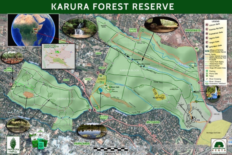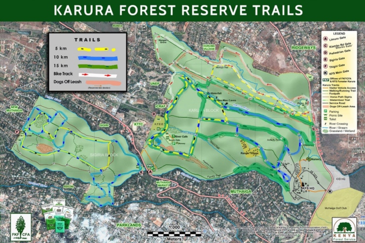 Note that in the northern portion of Karura, two main tracks — Muhugu Trail as well as north of and including half of Wangari Maathai Track — are currently designated Dogs Off-Leash. The Off-Leash areas are clearly marked on the map.